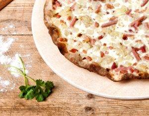 „Nach Original Elsässer Art“ belegt mit Schmand, Speck & Zwiebel