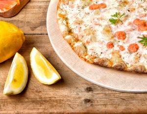 „Lachs & Shrimps“ belegt mit Schmand, Wildlachs & Shrimps